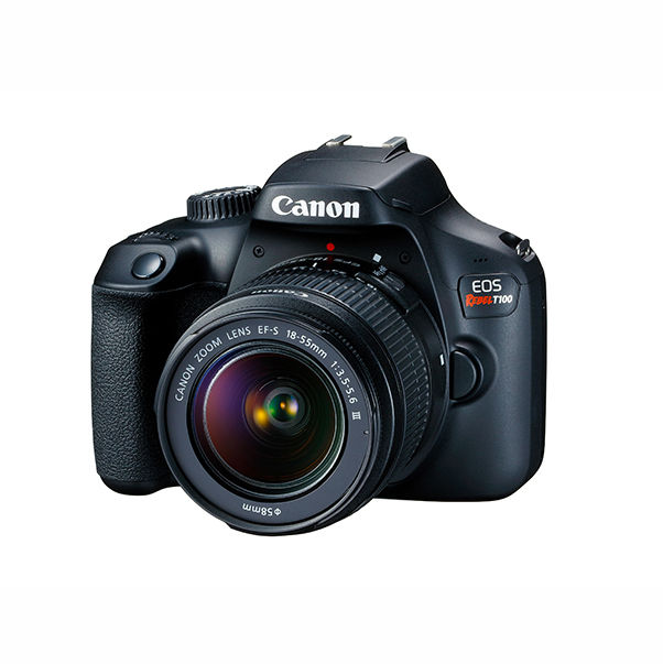 Cámara EOS Rebel T100 KIT 18-55. Canon tiene ante tus ojos la nueva modalidad para la captura y grabación de tus proyectos y grandes momentos. Este modelo destaca por su sensor CMOS APS-C (22.3 x 14.9 mm) de 18 Megapíxeles y grabación de en video con calidad Full HD (1080p). Posee alta sensibilidad hasta 12.800 (6400 nativa) ISO. Consigue 3 fotos por segundo en modo ráfaga y múltiples Modos Creativos y Basic+ para una versatilidad en tu material.